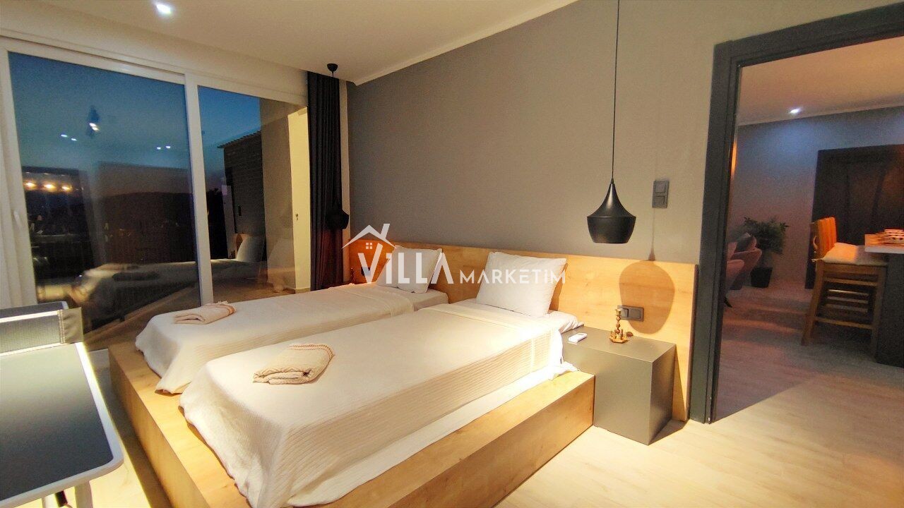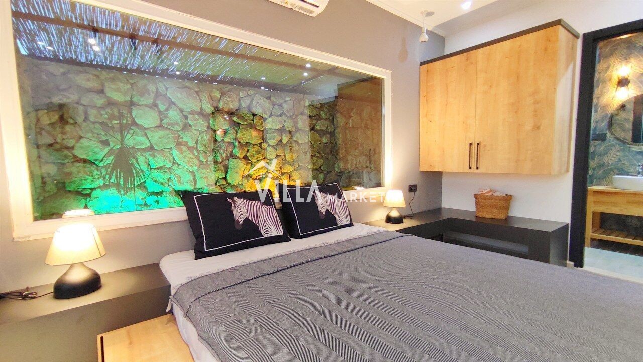 Ebeveyn yatak odasindaki, yatak arkasi camdır ve arkadaki, o oda için özel insaa edilmiş, tropikal bahçeyi görür. Banyo kısmında çift tarafli sevgili duşu ve oradan bu özel bahçeye çıkış vardir. Bahcede çay, kahve keyfi yapilabilir 2 kisilik, küçük fransiz cafe masa ve sandalyeleri bulunur. Ayrica odada bağımsız jakuzi vardir. Jakuzi keyfi yaparken yine yüzme havuzu ve patara manzarasi kesintisiz izlenebilir. İkinci odada, özel yaptirilmis ahsap yatak, birleştirilip ister büyük boy yatak, istenirsede tek kisilik çift yatak haline getirilebilir.