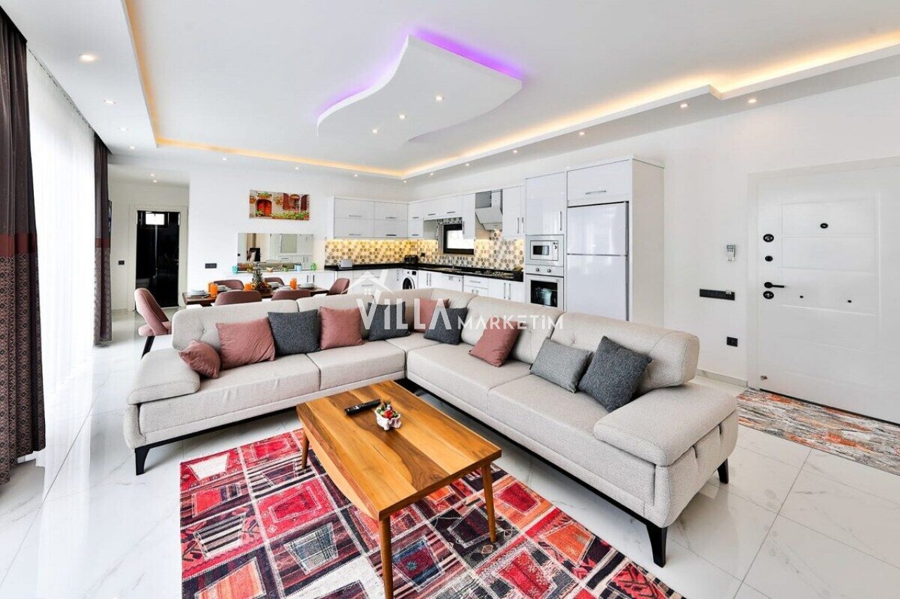 Salon: Villamızın geniş ve ferah salon katı içerisinde oturma grubu, LCD TV, yemek masası, kablosuz modem, uydu, sehpa, ütü, ütü masası, elektrik süpürgesi, klima, banyo ve tuvalet bulunmaktadır. Salondan havuz terasına direk çıkış yapılabilmektedir.